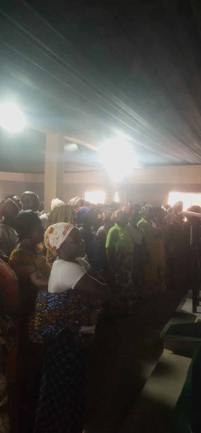 The image depicts a crowded indoor gathering in Kafanchan A, Nigeria