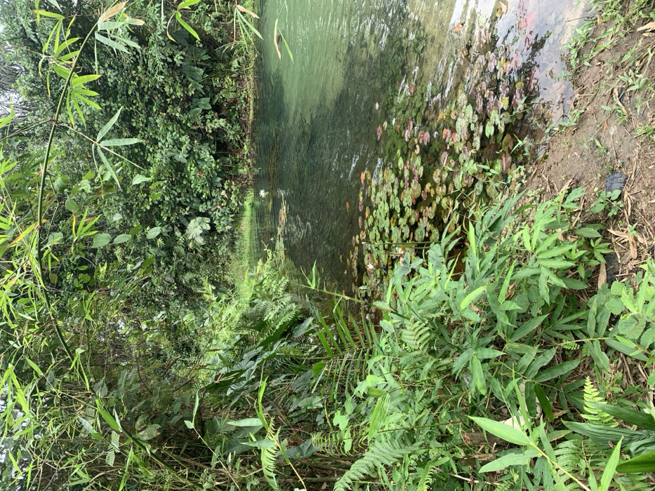 The image displays a natural, verdant aquatic environment in Ikot Obio Ata, Nigeria