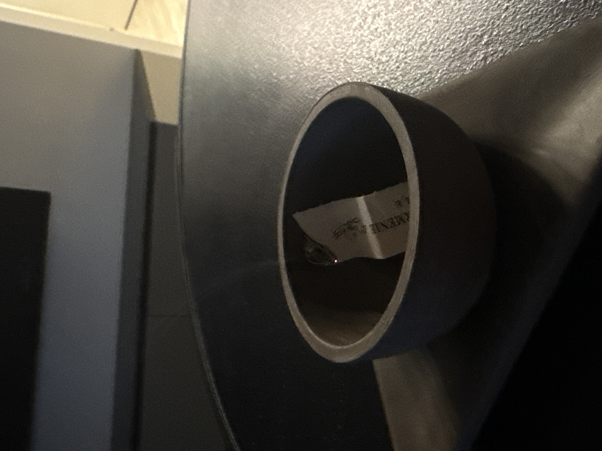 A close-up shot shows a dark, round, hollow object mounted on a larger, textured, dark surface. Inside the hollow object, a small piece of paper with illegible writing is visible. To the left of the object is a wall with varying shades of gray. The lighting appears dim, casting shadows across the scene. It is not possible to infer the location in Yerevan, Armenia, from the image alone.