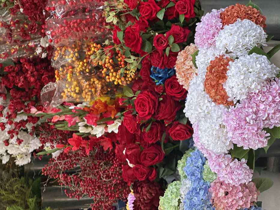 - "The image displays a densely packed, vertical arrangement of artificial flowers and decorative berries, indicative of a market stall or vendor, likely situated on a street such as Hàng Mã in the Old Quarter of Hà Nội, Vietnam" by FM-S4vcm1, licensed under CC BY 4.0