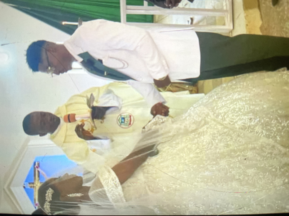 An indoor scene in the city of Mara, Nigeria, depicts a wedding ceremony involving three individuals positioned on a light-colored elevated platform