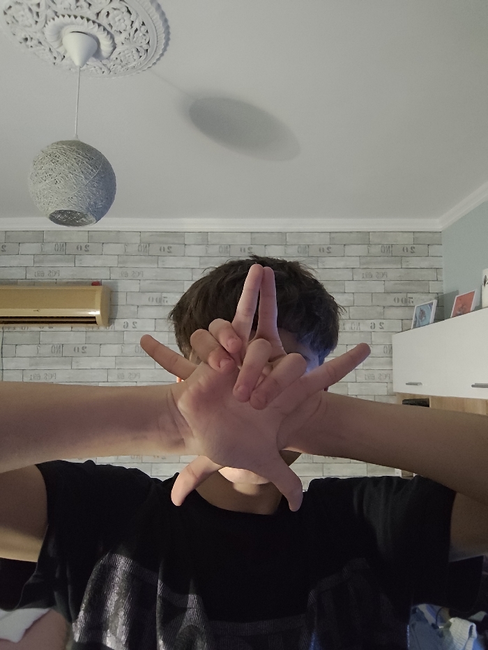 A subject is photographed indoors, likely in a residential setting, in Dimitrovgrad, Bulgaria. The image captures the individual's upper torso and head; their face is completely obscured by their hands. The subject has short, dark hair and wears a dark-colored t-shirt with a light-colored graphic design across the chest. Both hands are raised in front of the face, crossed at the wrists. The right hand (viewer's left) has the index and middle fingers extended upward in a 'V' or 'L' shape, with other fingers curled. The left hand (viewer's right) is splayed, with fingers pointing generally outward, overlapping the right hand to create a complex, multi-pointed gesture. The background wall features a light grey faux-brick pattern with faint, repetitive alphanumeric characters and phrases (e.g., "020 021", "ON US SO"). A beige split-system air conditioning unit is mounted on the wall to the left. A white ceiling molding runs across the top of the wall. The white ceiling above features an ornate, circular medallion from which a spherical, light grey woven pendant light fixture is suspended. A distinct shadow of this light fixture is cast on the ceiling to its right. To the far right, a portion of a white cabinet or shelving unit with silver handles is visible, with several small framed objects or cards placed on its surface.