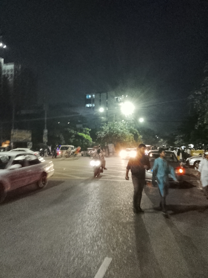 This image captures a nighttime street scene in Dhaka, Bangladesh, illuminated primarily by artificial light sources