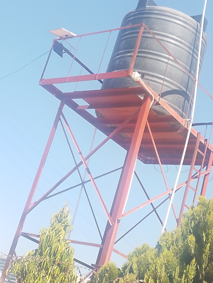 - "In the city of Kwang, Nigeria, a dark grey, corrugated plastic water tank rests atop a prominent, reddish-brown metal support structure" by FM-SEW8s2, licensed under CC BY 4.0