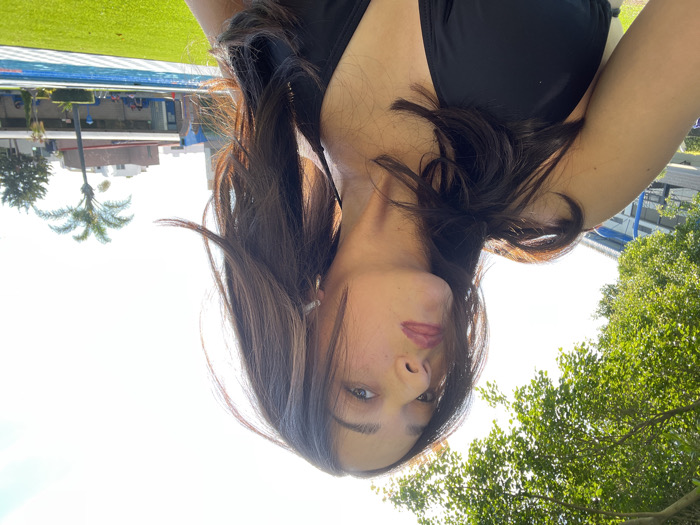 A woman in a black swimsuit poses for a selfie under bright sunlight. Her long, dark hair falls around her face. Behind her, a grassy area transitions into a building complex featuring a pool and palm trees. Lush green trees are also visible on the right. The photo has a casual, outdoor feel.