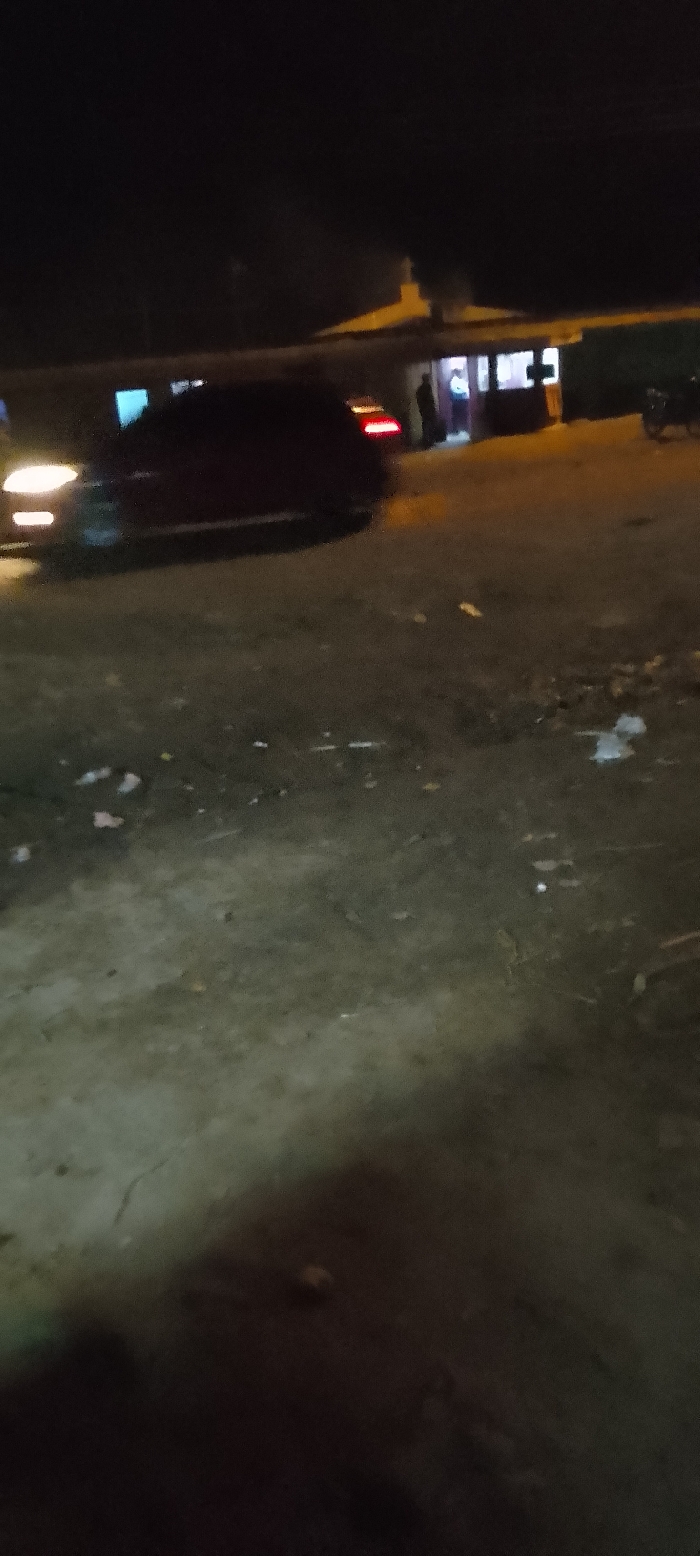 A dark, blurry nighttime scene features a car with illuminated headlights and taillights parked on a rough surface with scattered debris. In the background, a building with lit windows has a person standing near the entrance. A motorcycle is also visible. The overall image quality is poor, with low light and significant blurriness.