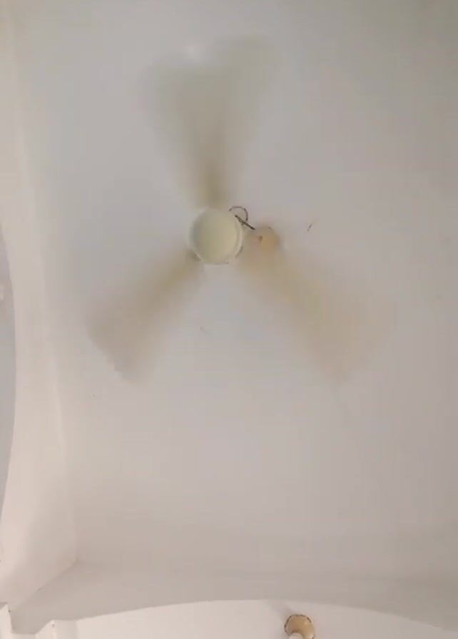 white ceiling fan spinning in a white room. Below the fan, near the edge of the frame, a small, simple ceiling light fixture is visible. The video is shot from below, looking directly up at the ceiling. The fan's blades appear blurred due to their rotation. The room appears to be well-lit.