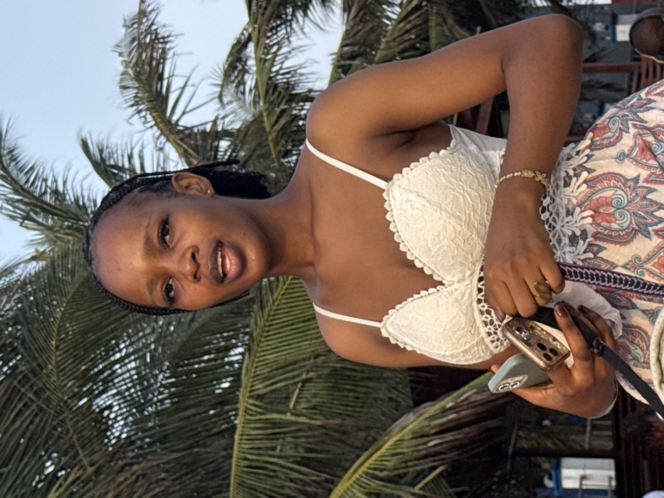 - "A woman wearing a white lace top and patterned pants stands outdoors with palm trees in the background" by FM-ddIDX2, licensed under CC BY 4.0