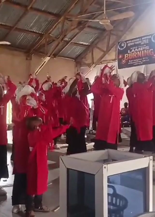 A group of people, primarily adults and a few children, are on a raised stage in what appears to be a church or large meeting hall. They are all wearing matching red robes with white head coverings. They are raising their arms in unison, as if in prayer or celebration. The hall has a high, beamed ceiling, with ceiling fans visible. A banner with the words "KEEP YOUR LAMPS BURNING" hangs behind them. The floor is a light, possibly concrete, and there is a clear podium on the floor in front of the stage. The overall atmosphere appears to be religious or spiritual.