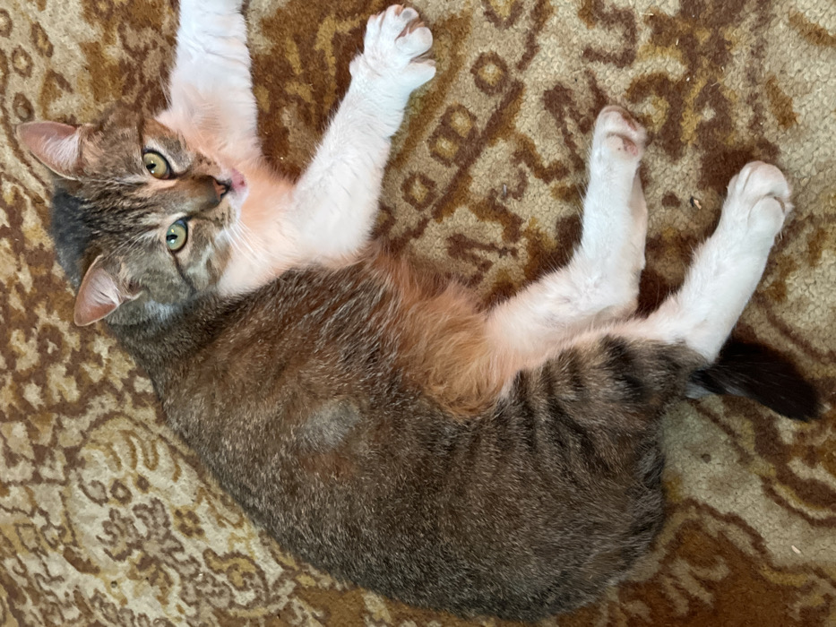 - "A domestic shorthair cat is observed lying on its left side on a patterned rug in Gara Oreshets, Bulgaria" by FM-47eGY2, licensed under CC BY 4.0