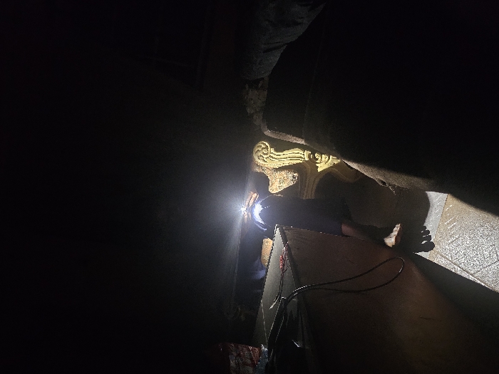 A person with a headlamp is inside a dark, confined space, possibly a cave or underground structure. They are examining a golden, ornate architectural element, possibly a column capital. The person is lying on or leaning over a structure that appears to be made of stone or concrete. The scene is dimly lit by the headlamp, creating stark contrasts between light and shadow. There are other dark, undefined objects in the background.