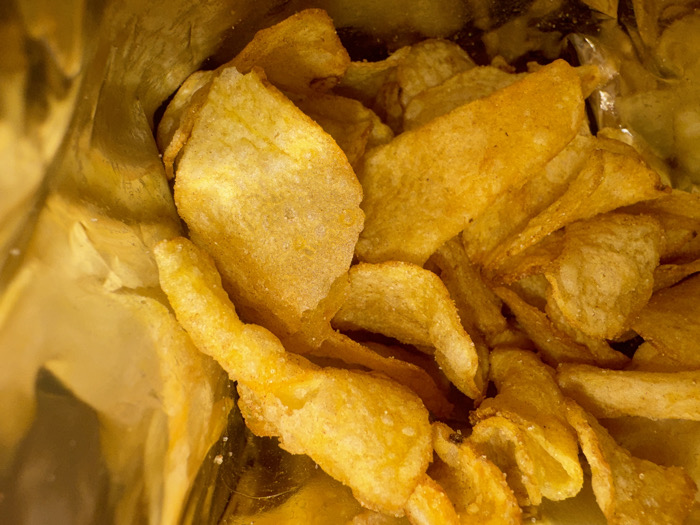 - "A close-up, internal view reveals numerous potato chips within a flexible, metallic-lined snack bag" by FM-dHc953, licensed under CC BY 4.0