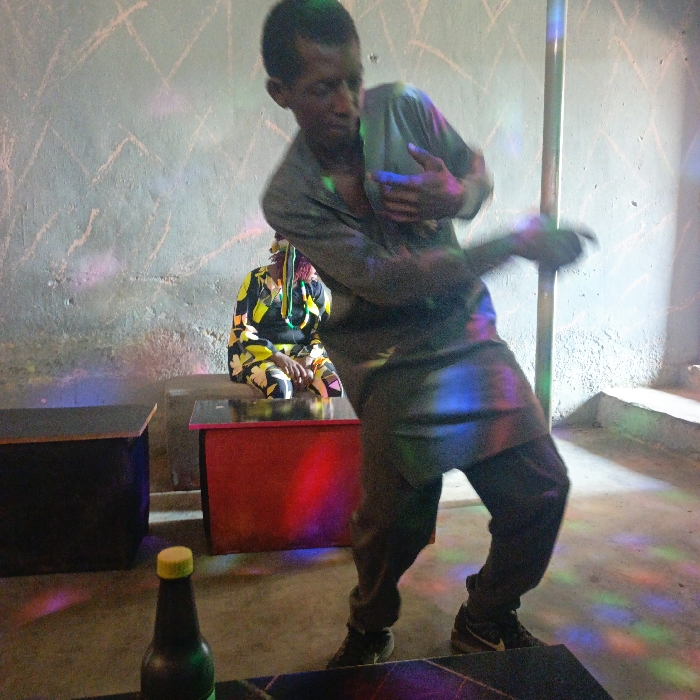 The image depicts an indoor scene in the city of Dong, Nigeria, characterized by multi-colored disco lighting. A lean male subject, dressed in a dark grey long-sleeved shirt, dark trousers, and dark sneakers with white accents, is centrally positioned and captured in dynamic motion, suggesting dancing. He faces slightly away from the viewer, looking downwards and to his right, with his arms bent and hands near his chest. To the right of the male subject, a light-colored vertical pole extends upwards. In the background, a second individual, seated on a dark red low table or stool, is visible. This person wears a brightly patterned garment incorporating yellow, black, green, and red designs, along with a distinct head covering. Their posture is still, with hands clasped in their lap. To the left of the seated individual, another dark, low table or stool is present. The walls are rough, light-colored concrete, marked with faint, irregular white lines or patterns. In the bottom-left foreground, a dark glass bottle with a yellow cap rests on a flat surface. The floor appears to be a hard, concrete-like material.