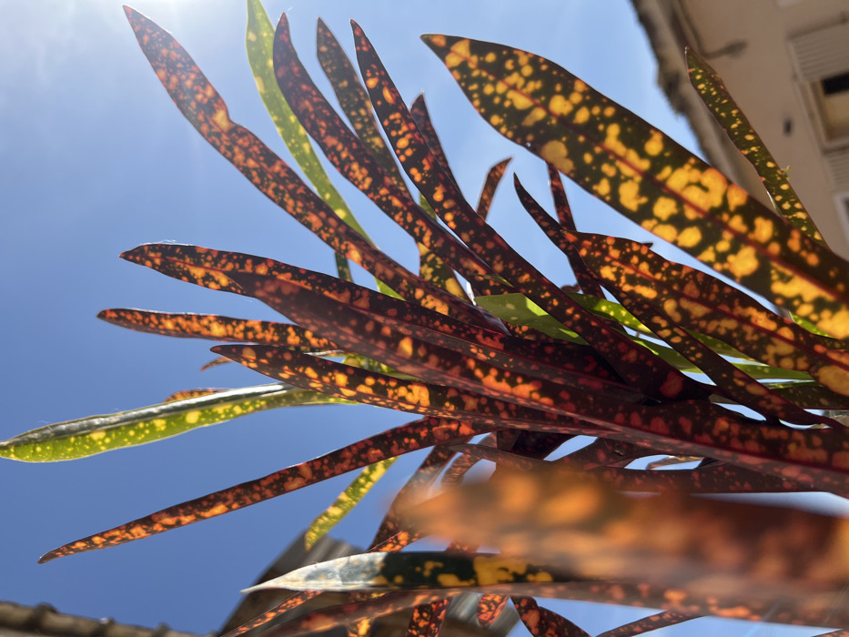 - "The image displays a close-up, upward-angled view of a plant featuring long, pointed, variegated leaves, consistent with a Croton species" by FM-Z7ZQT2, licensed under CC BY 4.0