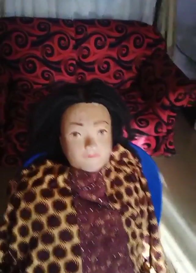 A mannequin head with black hair is positioned on a blue plastic chair. It is dressed in a patterned brown and gold garment over a sparkly maroon top. Behind the mannequin is a red and black patterned couch and a white curtain. A hand reaches into the frame and violently knocks over the blue chair.