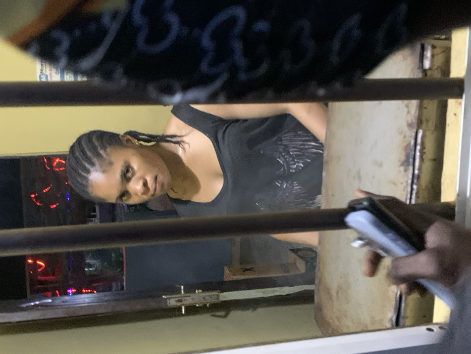 A woman with braided hair and a black tank top looks out from behind metal bars. She gazes towards the camera with a slight downward tilt of her head. The background includes a partially visible box and blurred festive lights. A hand holding a cell phone appears in the lower right corner, seemingly taking a photo. An object with light-colored scribbles is visible at the upper part of the frame.
