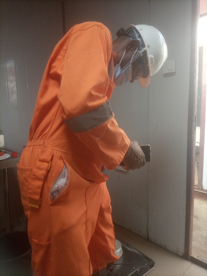 A person in an orange jumpsuit and white hard hat uses a smartphone. They wear a blue face mask. The jumpsuit has reflective stripes on the arms. The person is bent forward. A plastic bag is visible in the jumpsuit's pocket. The background appears to be a plain room with an electrical outlet on the wall and a doorway to the right. A metal tray with what looks like a bowl on top sits on the floor.