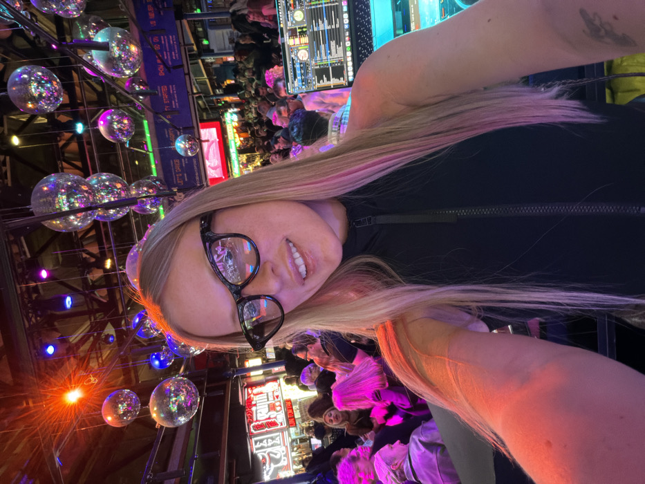 A young woman with blonde hair and black-rimmed glasses takes a selfie in a crowded club