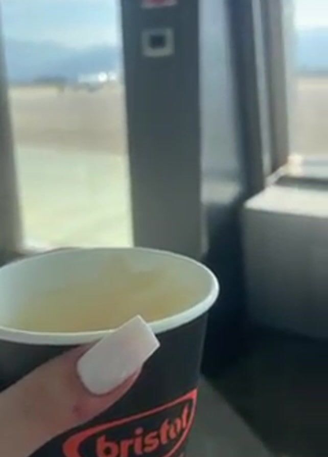 A person holds a half-empty coffee cup with the Bristot Belluno Italia logo in their hand. The hand has a square white fingernail. The background shows a window overlooking an airport tarmac with an airplane visible. The scene is well-lit with natural light. A grey column beside the window has wall switches and a fire extinguisher safety sign.