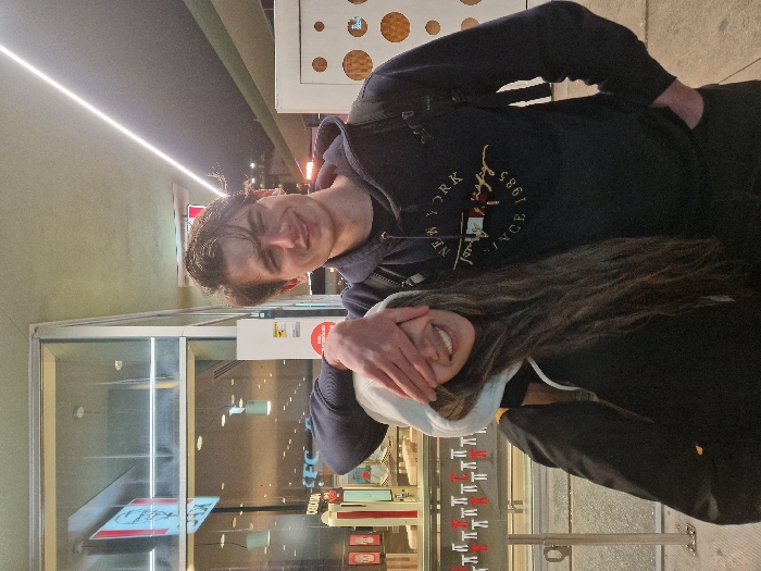 A man stands behind a woman, covering her eyes with his hand. Both are smiling. The man is wearing a dark hooded sweatshirt with "New York" and "1985" printed on it. The woman is wearing a black jacket with a white hoodie underneath. They are in front of a storefront with a red and white sign visible through the glass. A bright light fixture runs along the ceiling above them.