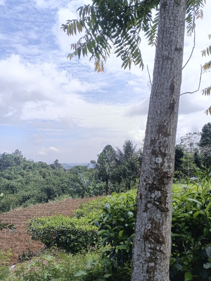 A verdant landscape unfolds under a partly cloudy sky. In the foreground, a tree trunk dominates the right side, with leaves extending from above. Beyond, a hillside features a mix of brown tilled soil and lush green vegetation. Further back, a dense forest extends towards a distant horizon. The cloudy sky offers varied tones of blue and white, adding depth to the scene.