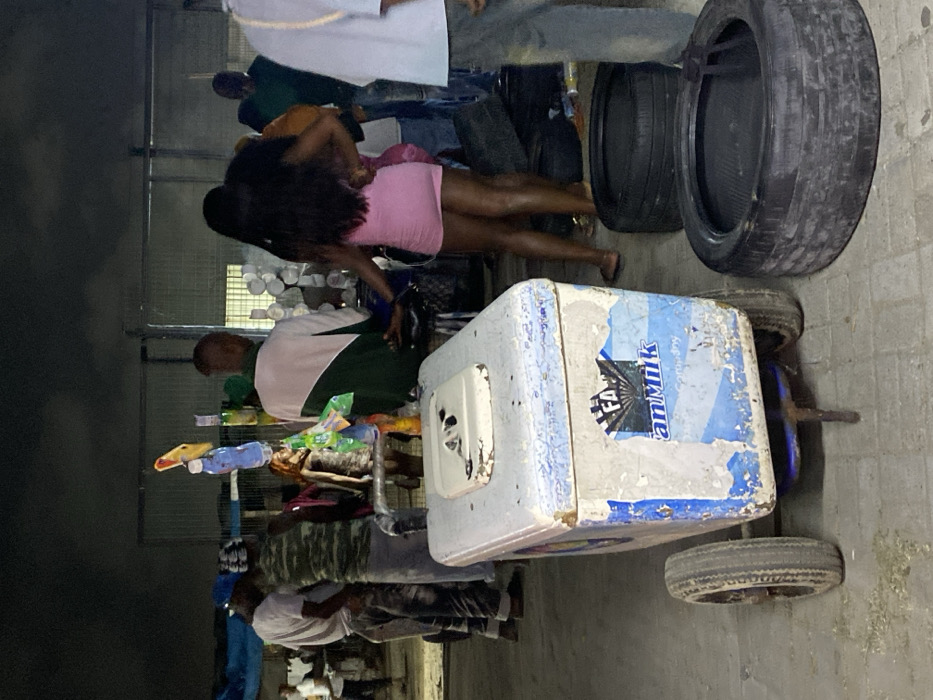 A group of people are gathered near a makeshift cart constructed from a worn-out cooler and small tires. The cooler has peeling paint and a faded advertisement. The cart is loaded with various items, including plastic containers, bottles, and packaged goods. Several tires, likely spares for the cart, are stacked nearby. A woman in a pink dress stands close to the cart. Other people are also standing, blurred, around the makeshift cart.