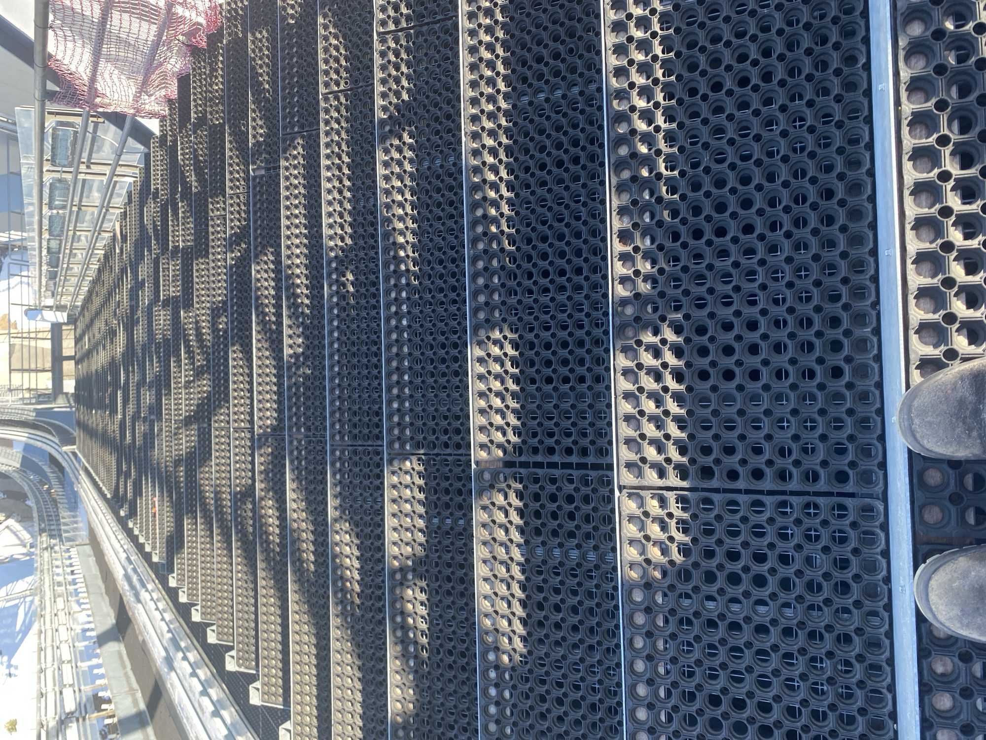 The image depicts a walkway with a series of black rubber mats laid out in rows