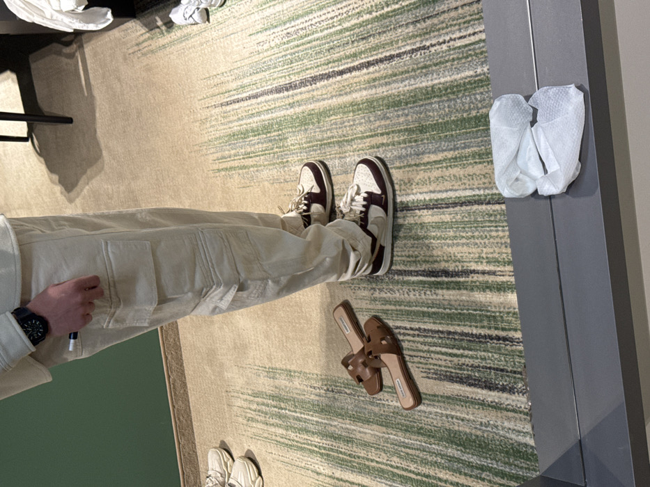The scene is an interior view, located in the city of Obzor, Bulgaria, showing the lower half of an individual standing on a patterned carpet. The individual is wearing light beige cargo pants with flap pockets on the legs, white socks, and burgundy and off-white athletic shoes with white laces. A dark-colored wristwatch is present on the left wrist, and a white-tipped marker or pen is held in the right hand. On the carpet, to the left of the individual's feet, two brown, flat-heeled slide sandals are placed; the insole of one sandal displays partial branding as "VALENTINO." Further to the left, parts of two light-colored chunky athletic shoes are partially visible. The floor is covered with a carpet featuring a vertical striped pattern in shades of beige, green, and dark gray. A plain green wall is visible in the background to the left. In the lower foreground, a dark gray surface with a reflective strip along its top edge is visible, upon which two crumpled white paper or fabric items rest. In the background on the right, a dark furniture leg and crumpled white fabric are dimly discernible.