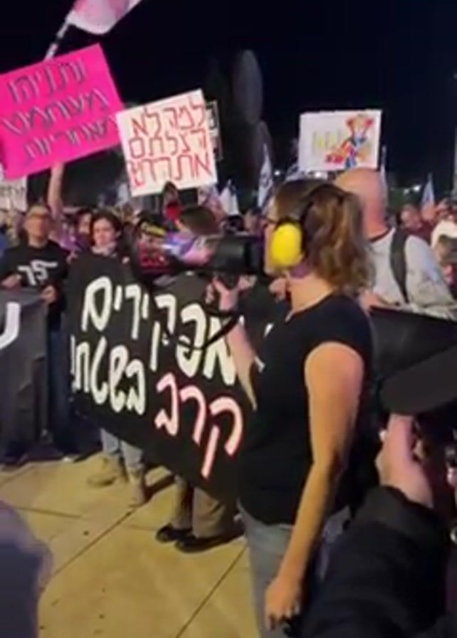 crowd of people protesting at night. The focus is on a woman wearing a black shirt, glasses, and yellow earmuffs, holding and speaking into a black megaphone covered in stickers. Behind her, people hold signs in Hebrew, one of which reads "מה לה להצלת אתתש". There are Israeli flags visible in the crowd. The environment appears to be an outdoor plaza. The camera's view is somewhat obstructed, but it is clear that there are many people present and active in the protest.