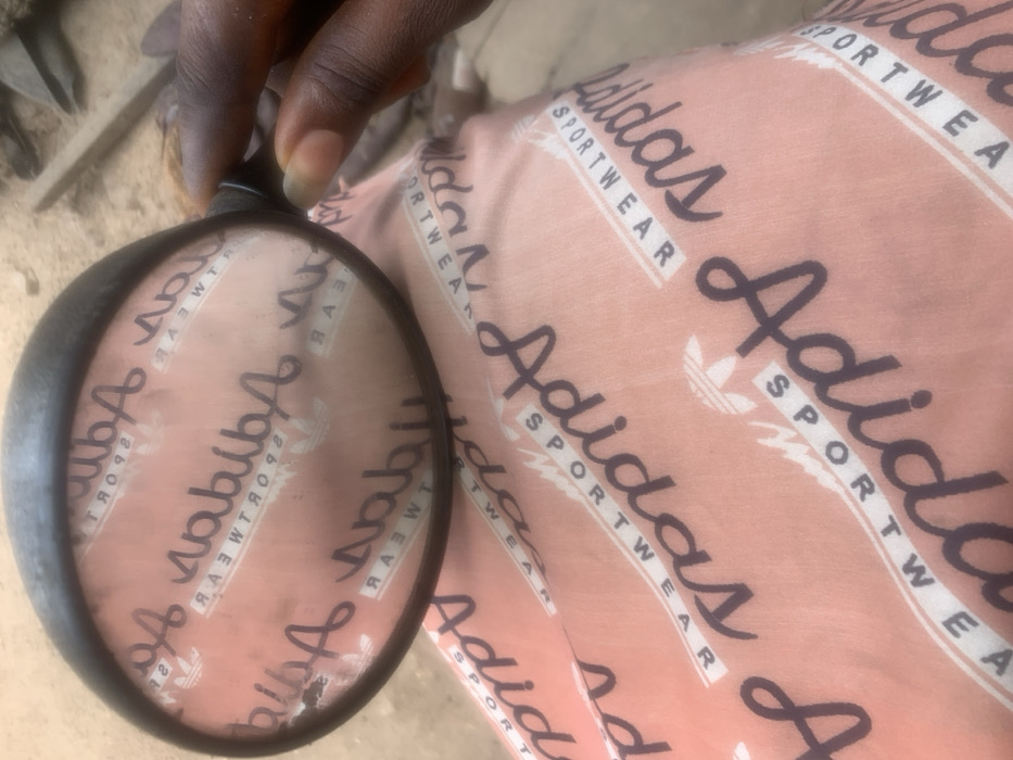 An overhead, close-up photograph depicts a dark-skinned hand holding a black-framed magnifying glass over a peach-colored fabric. The fabric displays a repeating pattern of the word "Adidas" in a dark script font, accompanied by "SPORTWEAR" in capital letters and a white Adidas trefoil logo. Within the circular lens of the magnifying glass, the underlying fabric pattern is magnified and horizontally reversed, rendering "Adidas SPORTWEAR" as "sabibA R A E W T R O P S". The visible portion of the hand, including the thumb, index finger, and part of the middle finger, grips the magnifying glass's handle. Fingernails are present. The background behind the subject consists of a light brown, uneven surface, consistent with ground, and a blurred, darker linear object on the right. This scene is located in Lokoja, Nigeria.