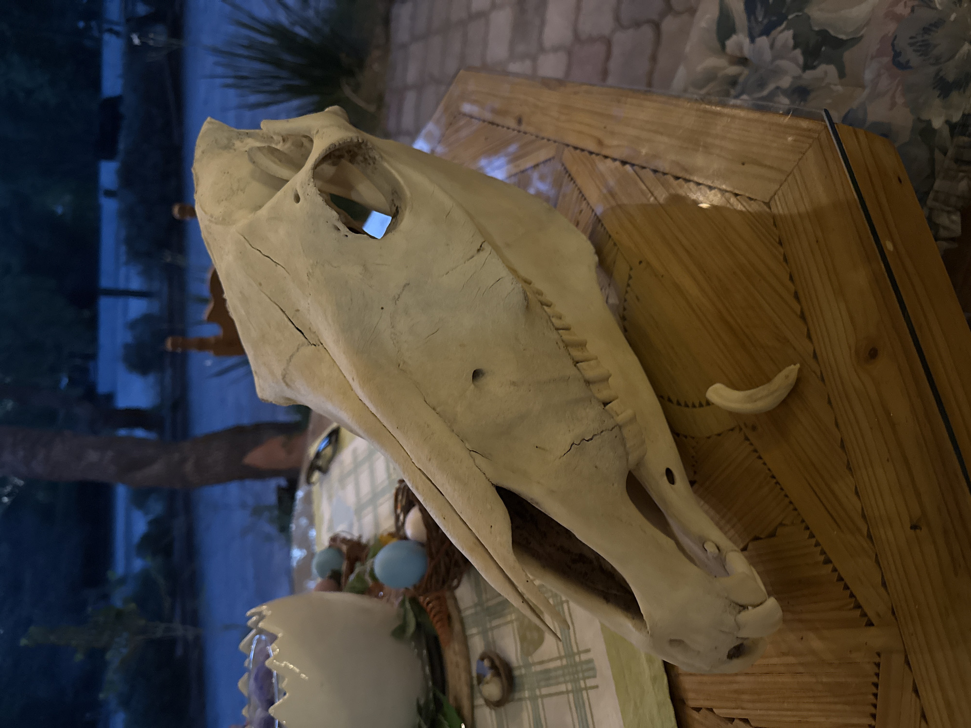 The image depicts a horse skull placed on a wooden table covered with a checkered tablecloth. The table is next to a glass window with an exterior view of trees. Based on the details provided, the image was taken in Cañada de Madero, Mexico.