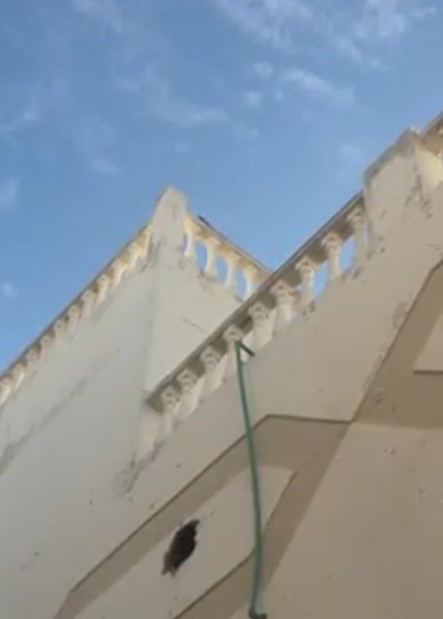 low-angle shot of a white building against a blue sky with wispy clouds. The building has a decorative balustrade along the roofline. There's a hole in the wall and a green hose running down the side of the building. A bird is briefly visible perched on the corner of the roof.
