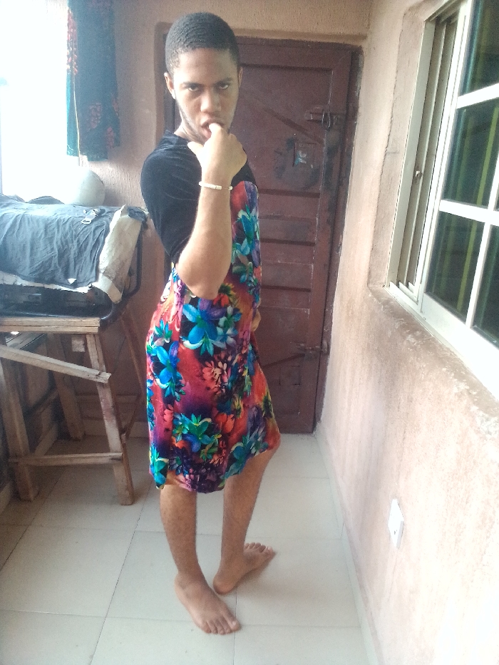 The image depicts a single individual, appearing male, standing barefoot on a light-colored tiled floor within an indoor or semi-enclosed space. The location is in the city of Unknown, Unknown. The individual has short, dark hair and is wearing a black long-sleeved top underneath a sleeveless, knee-length dress featuring a vibrant floral pattern with red, pink, blue, and green hues. A light-colored bracelet is present on the right wrist. The individual faces the viewer directly, with a concentrated facial expression, and has the fingers of their right hand positioned near the mouth or chin. The background includes a dark brown wooden door with visible hardware on the left side of the frame, and a light peach-colored wall on the right. A window with white framing and apparent security bars is set into the right wall. Near the left edge of the frame, a wooden stool or small table holds dark, folded fabric. A light-colored electrical outlet or switch is visible on the lower right wall. Curtains are partially visible in the upper left corner.
