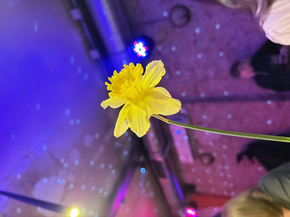 A photograph captures a single yellow daffodil in sharp focus, positioned centrally against a blurred, vividly lit indoor background