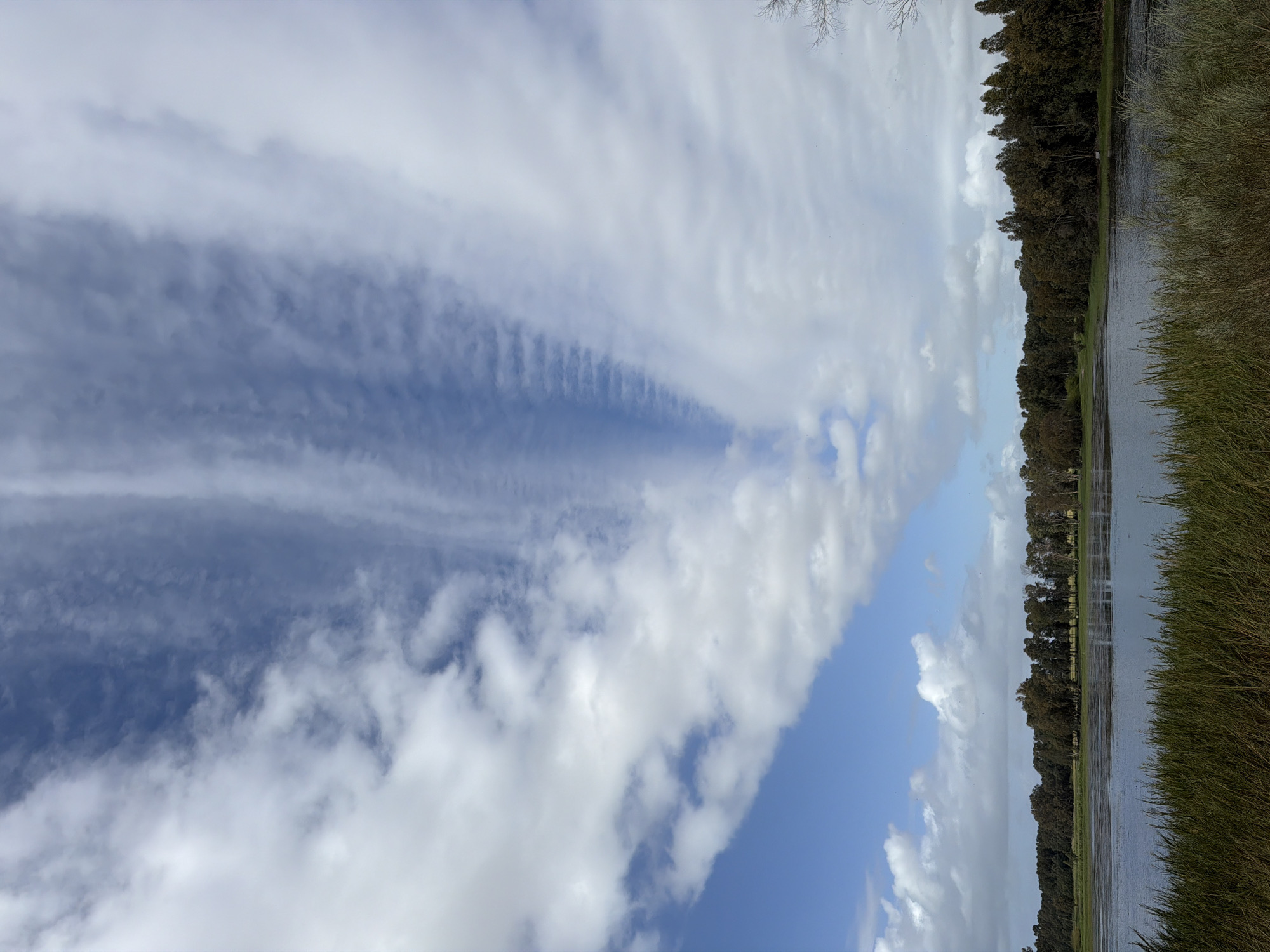 landscape scene in Hadera, Israel. The sky occupies most of the frame, exhibiting a mix of clear blue patches and striated cloud formations. A distinctive band of regular, wavelike cloud patterns extends vertically. The right side of the image features a narrow body of water, likely a lake or river, bordered by a line of trees and some tall grasses. There is no evidence of people, interaction, or other objects beyond the natural environment.