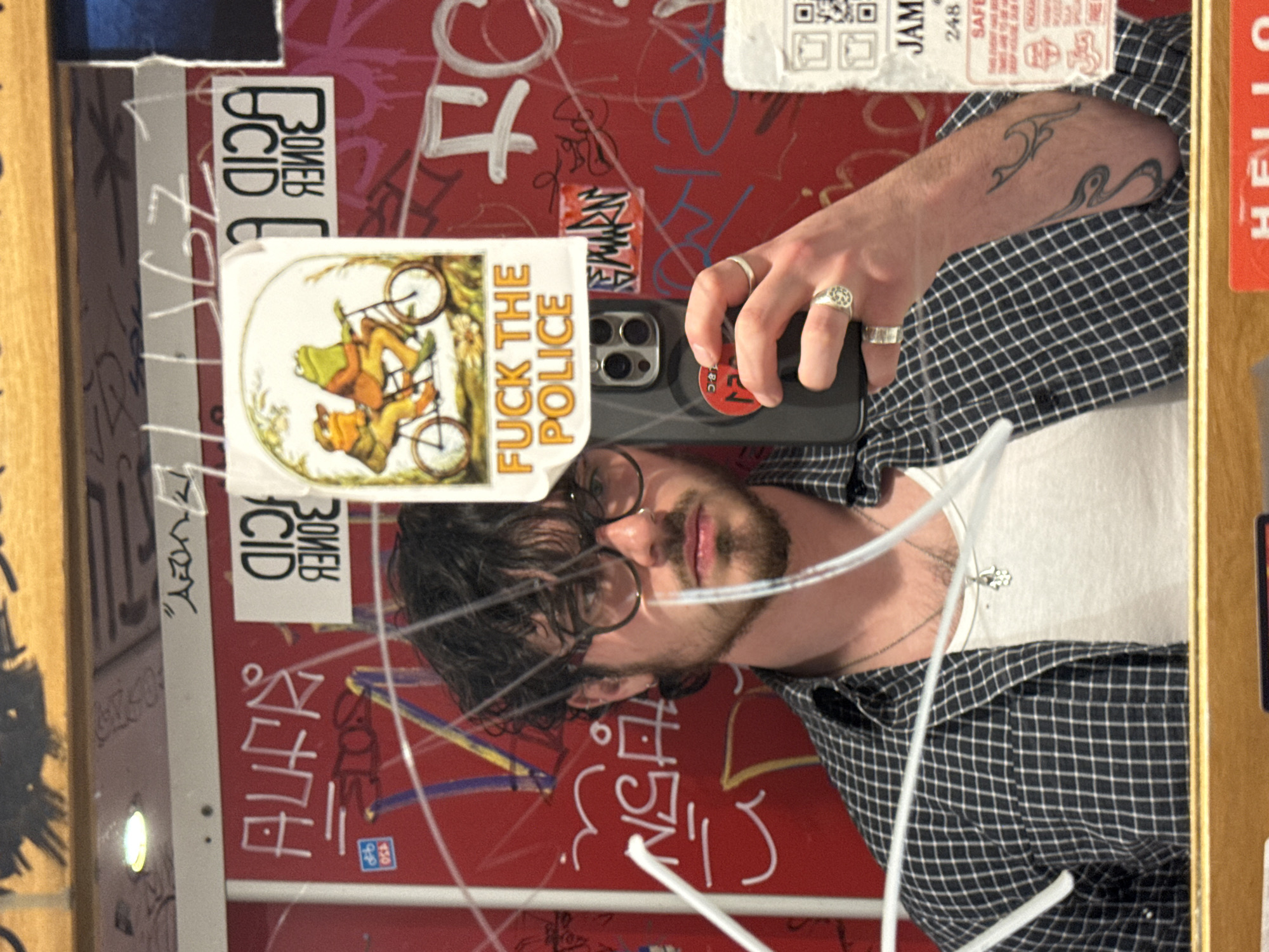 A selfie is taken in front of a graffiti-covered mirror. The person holds a smartphone with a black case and a red sticker on the back. The person has dark hair, glasses, and a beard, wearing a checkered shirt over a white t-shirt and a necklace. Tattoos are visible on their left forearm. The mirror background shows various stickers, graffiti, and writings, including "FUCK THE POLICE" in orange text. The mirror appears to be in a public space. The location in the city of Unknown, Unknown, is unknown.