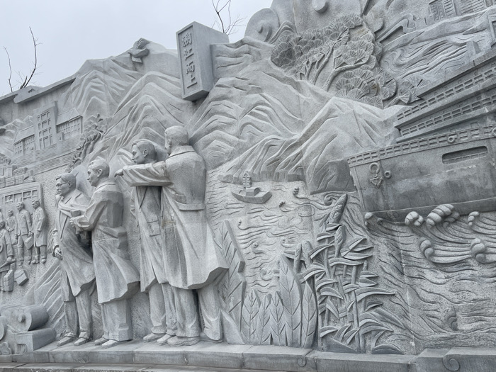 A large, gray stone carving depicts a historical scene. Several men in suits stand in the foreground, one pointing. Behind them are mountains and a body of water with a boat. A large ship is also carved on the right. A building is on the left. Calligraphy is etched into a raised rectangular block. The scene is intricate, with detailed textures and varying depths.