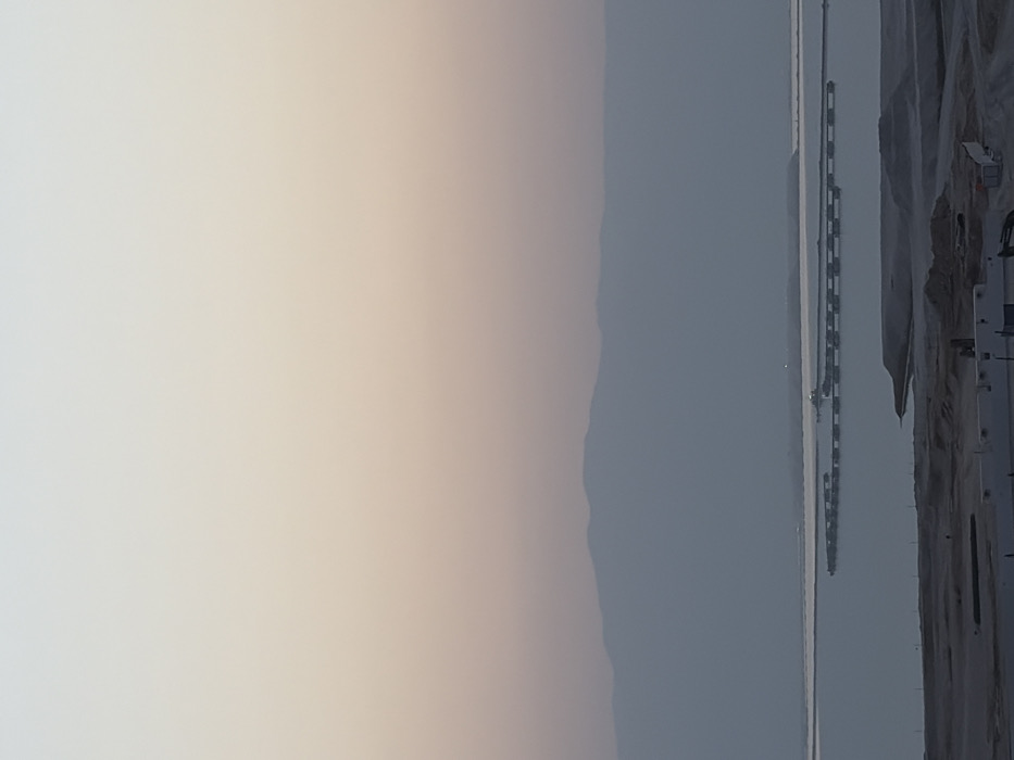 A serene landscape with a clear sky transitioning from light to pale tones. A mountain range fades into the horizon. A body of water reflects the sky. Adjacent to the water, an industrial structure is seen, possibly a dock or a pier, with vertical supports stretching into the water. Land meets the structure, with scattered details suggesting a construction site or a similar industrial area.