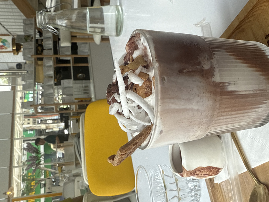 The scene is set indoors at a cafe or restaurant in Ngũ Hành Sơn Ward, Vietnam. The foreground features a tall, ribbed glass holding a layered brown and white beverage topped with whipped cream, white shredded coconut, brown toasted flakes, and a slender, dark brown stick. To the left, a clear glass with water and a small white ceramic pitcher with brown markings rest on a wooden tray, accompanied by a gold-colored spoon and a white napkin. A clear glass bottle with a metal clip-top, partially filled with water, is positioned on the white table to the right. In the background, a yellow chair back is visible. Behind it, a wooden shelving unit displays multiple white-wrapped items. Through a large window, a male individual wearing a dark shirt and light trousers is seen standing, possibly attending to an area, with green foliage and general street elements discernible outside.