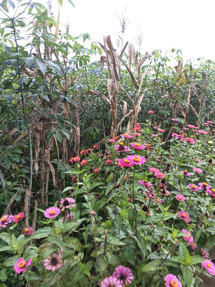 The image displays a dense garden scene. Corn stalks stand amongst lush green cassava plants, creating a mixed vegetation background. In the foreground, a vibrant patch of pink and red zinnia flowers adds a pop of color and contrasts with the green foliage. The scene is a blend of agricultural crops and decorative flowers, giving it a wild, cultivated feel.