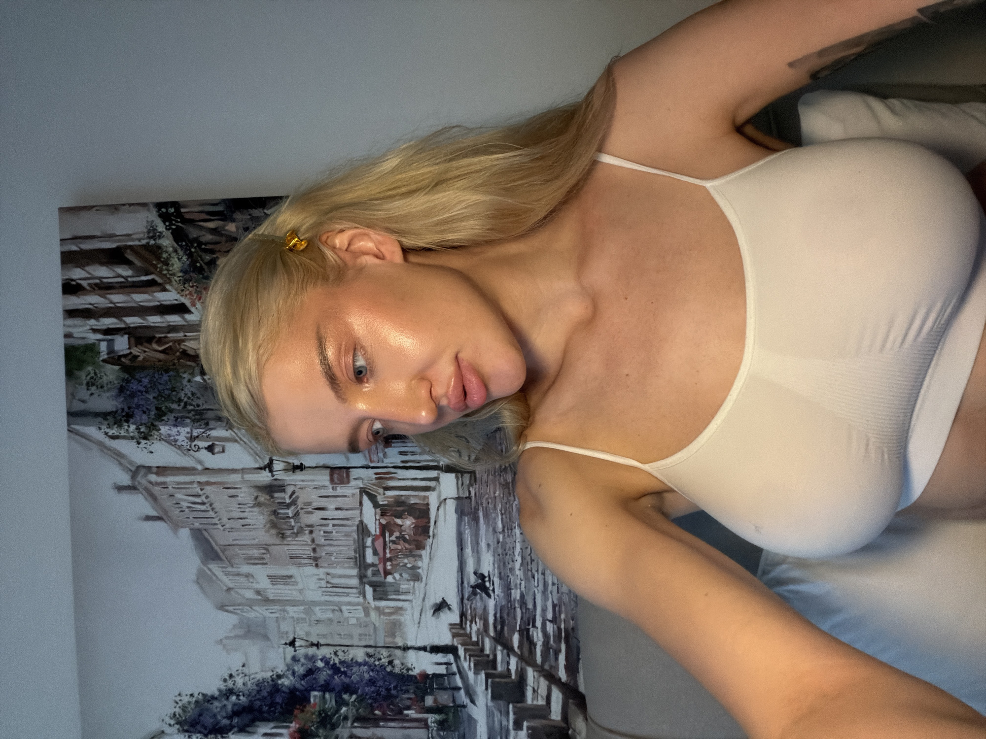 A woman with long, blonde hair, wearing a white tank top, is positioned in front of a framed picture