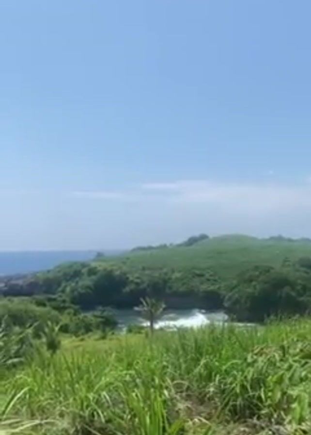 scenic view of a coastline. Tall green grass dominates the foreground, while lush green hills and trees cover the land extending towards the ocean. The ocean is a deep blue, stretching to the horizon under a clear, light blue sky. The camera pans slightly, revealing more of the coastline and the vast expanse of the sea. The scene is peaceful and natural, with no people or discernible human activities in view.