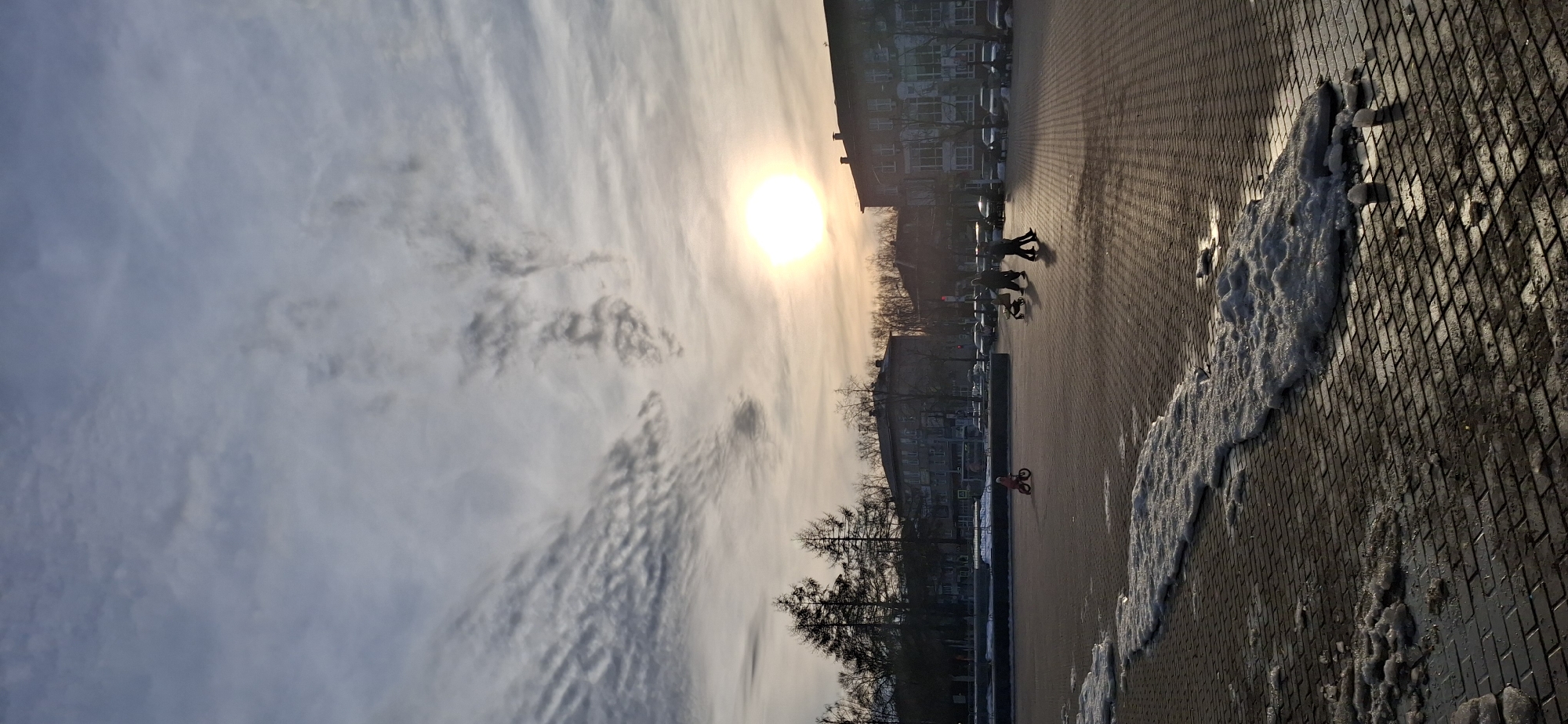 The image depicts an urban public square in Chaikovsky, Russia, observed during late afternoon or early morning. The scene is illuminated by a low-hanging sun, prominent in the upper-right quadrant, casting long shadows and a strong glare across the ground. The sky is partially cloudy, with cirrocumulus and altocumulus formations evident. In the foreground, a paved surface of dark interlocking bricks is visible, interspersed with irregular patches of melting snow and ice, indicating a transition season like late winter or early spring. Several wet spots reflect the sunlight. The mid-ground features a young child, dressed in a reddish-pink outfit, riding a small red balance bicycle towards the left side of the frame. To the right of the child, two adults are walking, accompanied by a dark-colored baby stroller. Their figures are partially silhouetted against the sun, casting elongated shadows across the brick pavement. The background consists of a street with numerous parked cars. Beyond the street, multi-story buildings, likely residential or administrative, with visible windows and dark facades, line the horizon. Bare deciduous trees and some coniferous trees are scattered between the buildings and along the square's edge. A red traffic light is discernable in the middle-right background. The overall environment suggests an active urban area during cooler weather conditions.