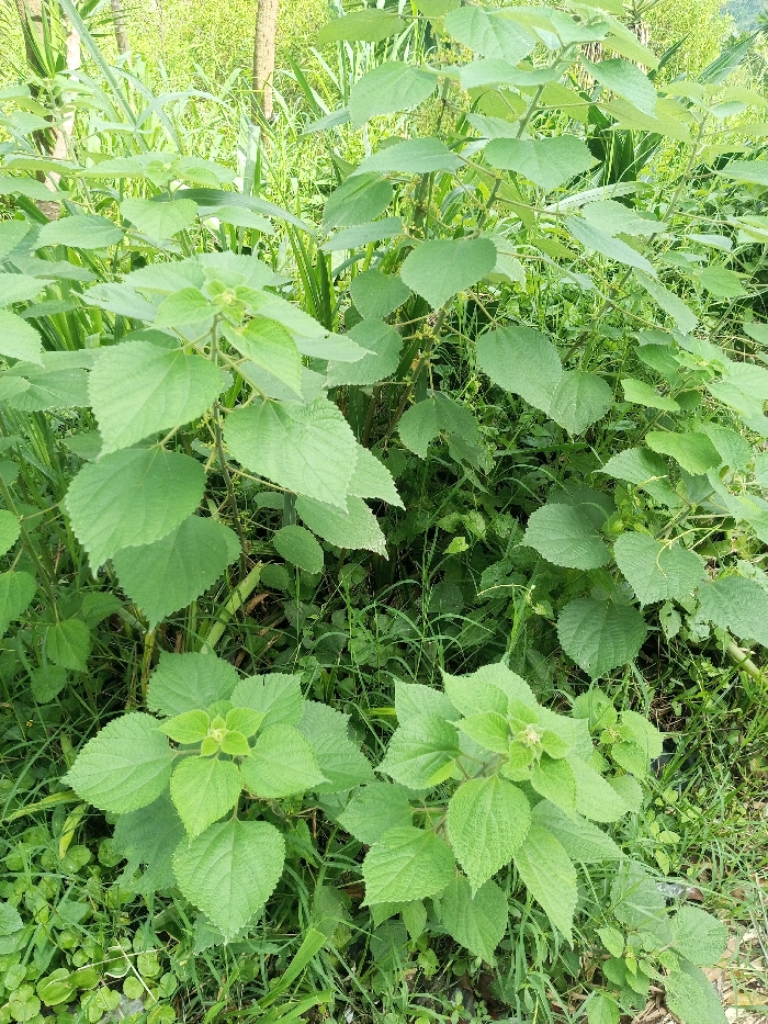 Lush green vegetation dominates the frame, featuring a thicket of plants with broad, textured leaves. The leaves exhibit a slightly serrated edge and a matte finish. A few flowering buds or seed capsules are visible among the foliage. The backdrop is a blurry mix of grass, smaller plants, and trees, suggesting a natural outdoor setting like a garden or a field.