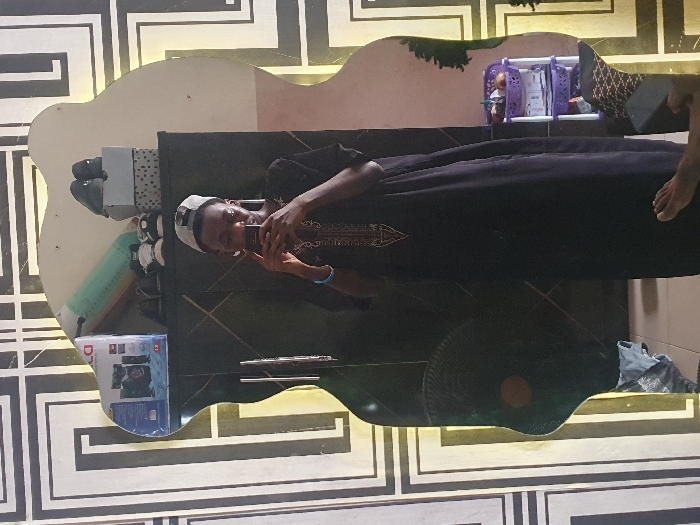 The scene depicts an interior room in Lokoja, Nigeria, observed through the reflection of an irregularly shaped mirror. A male individual, positioned centrally, is taking a mirror selfie using a black smartphone held with both hands. He wears a grey cap, a long dark-colored traditional garment with elaborate embroidery around the V-neckline, and a light blue wristband on his left wrist. A bare foot, likely belonging to the individual, is visible in the lower right corner, near a second dark-colored smartphone resting on the light-colored tiled floor. The background, visible in the mirror's reflection, includes a dark-colored wardrobe or cabinet with two vertical silver handles. On top of this cabinet are various items: a white box for a speaker system, a rolled light green object, several pairs of shoes (including sneakers and dark formal shoes), and a grey polka-dotted box. To the immediate left of the individual, a black standing fan is partially visible. To the right, a three-tiered purple plastic storage rack holds various small items. The walls are covered with wallpaper featuring a repeating geometric pattern of interlocking black and light-colored rectangular outlines. A piece of patterned cloth is draped on the floor near the fan on the left. The environment is an indoor domestic setting, appearing well-lit.