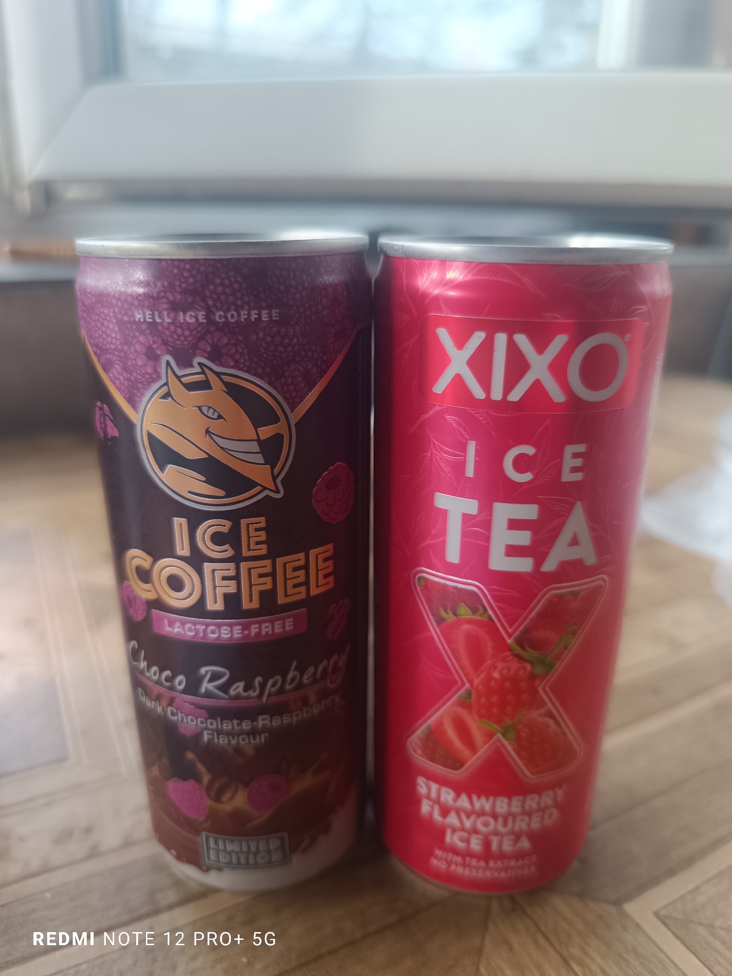 two unopened beverage cans standing side-by-side on a surface with a tile pattern, possibly a table or counter. The can on the left is purple and brown and is labeled "HELL ICE COFFEE" with a cartoon devil logo. The specific flavor is "Choco Raspberry Dark Chocolate-Raspberry Flavor," and it indicates that it is lactose-free. "LIMITED EDITION" is printed near the bottom. The can on the right is red and features the logo "XIXO ICE TEA." It is strawberry flavored. In the background, there is a partially visible window. The image was taken with a Redmi Note 12 Pro+ 5G mobile phone. No specific location in Targovishte, Bulgaria is identifiable from the image.