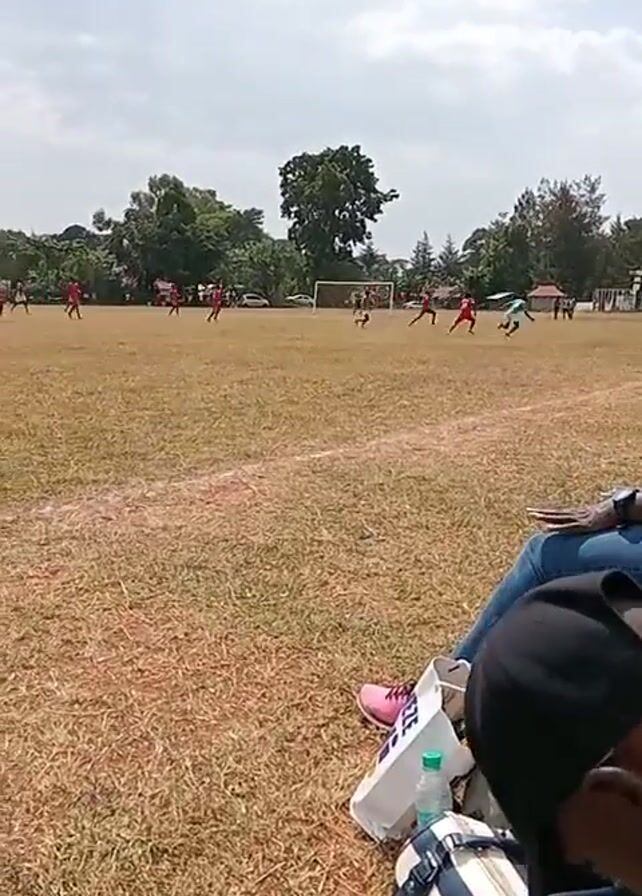 A low-angle video shows a soccer game being played on a grassy field. The sky is cloudy. The players are wearing red or green jerseys. Several spectators are visible on the sidelines. The person recording the video is sitting and watching the game. A bag, a water bottle, and a pair of shoes are next to the person. In the middle of the video, the person raises their hand in front of the camera. In the background are trees and buildings.