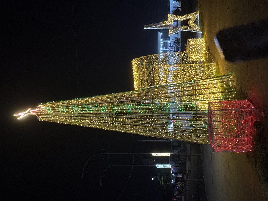 A brightly lit Christmas tree constructed of light strands dominates the night scene. It has a star on top and is decorated with yellow, green, and red lights. Behind the tree are other Christmas decorations, including a star shape and a cylindrical structure, also adorned with lights. The background is dark, with faint outlines of buildings and streetlights. Some people are visible in the distance, adding to the festive atmosphere.