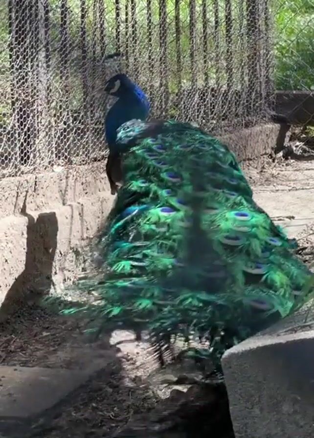 - "A vibrant peacock with a green, blue, and iridescent tail stands adjacent to a chain-link fence" by FM-GmT2c2, licensed under CC BY 4.0