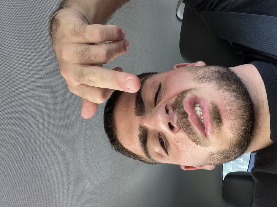 A close-up, low-angle selfie captures a young adult male inside a vehicle in Rishon LeZion, Israel. The male subject has dark short hair and a trimmed beard/stubble. His face exhibits a deliberate contortion, with his upper lip pushed upwards and to the left, revealing dental braces on his upper teeth. His left eye (viewer's right) is partially narrowed. A faint, crescent-shaped reddish mark is visible on his forehead, between his eyebrows. His right hand is positioned in the upper right of the frame, with the index and middle fingers extended downwards, knuckles showing hair, and a small red mark present on the right middle finger's knuckle. He is wearing a dark t-shirt, and a black seatbelt strap is visible across his right shoulder/chest. The vehicle's grey, textured headliner fills the upper background, while a dark car seat/headrest is visible to the lower right. A faint reflection of outdoor foliage is discernible through a rear window in the lower-left background.